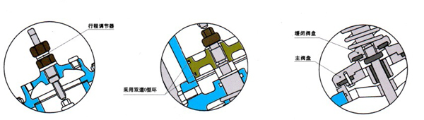 在該閥頂部設(shè)高行程調(diào)節(jié)裝置,可根據(jù)管道壓力、流量的大小調(diào)節(jié)主閥盤的開啟高度,從而可達(dá)到最佳的使用效果。在此位置可設(shè)置開度指示裝置或信號(hào)反饋裝置。